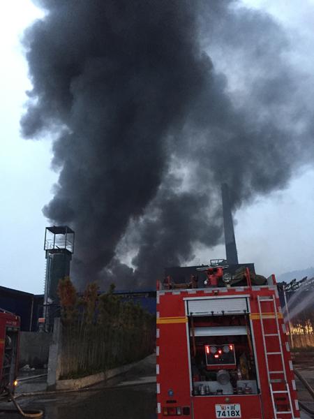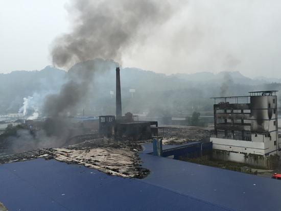 接到報警后,宜賓消防支隊下屬7個中隊、19輛各類消防車、100余名消防官兵迅速趕到現(xiàn)場進(jìn)行處置,同時,支隊?wèi)?zhàn)勤保障大隊緊急調(diào)集4噸泡沫滅火藥劑趕赴現(xiàn)場。消防官兵到達(dá)現(xiàn)場后,經(jīng)偵查沒有發(fā)現(xiàn)無人員被困。只見現(xiàn)場濃煙滾滾,一棟四層建筑和旁邊兩座鋼結(jié)構(gòu)廠房起火,過火面積較大,廠房石棉瓦頂棚和內(nèi)部可燃物正在劇烈燃燒,燃燒物質(zhì)有油、P2O4有機(jī)溶劑和裝硫酸鋅的膠桶等,現(xiàn)場情況十分危急。